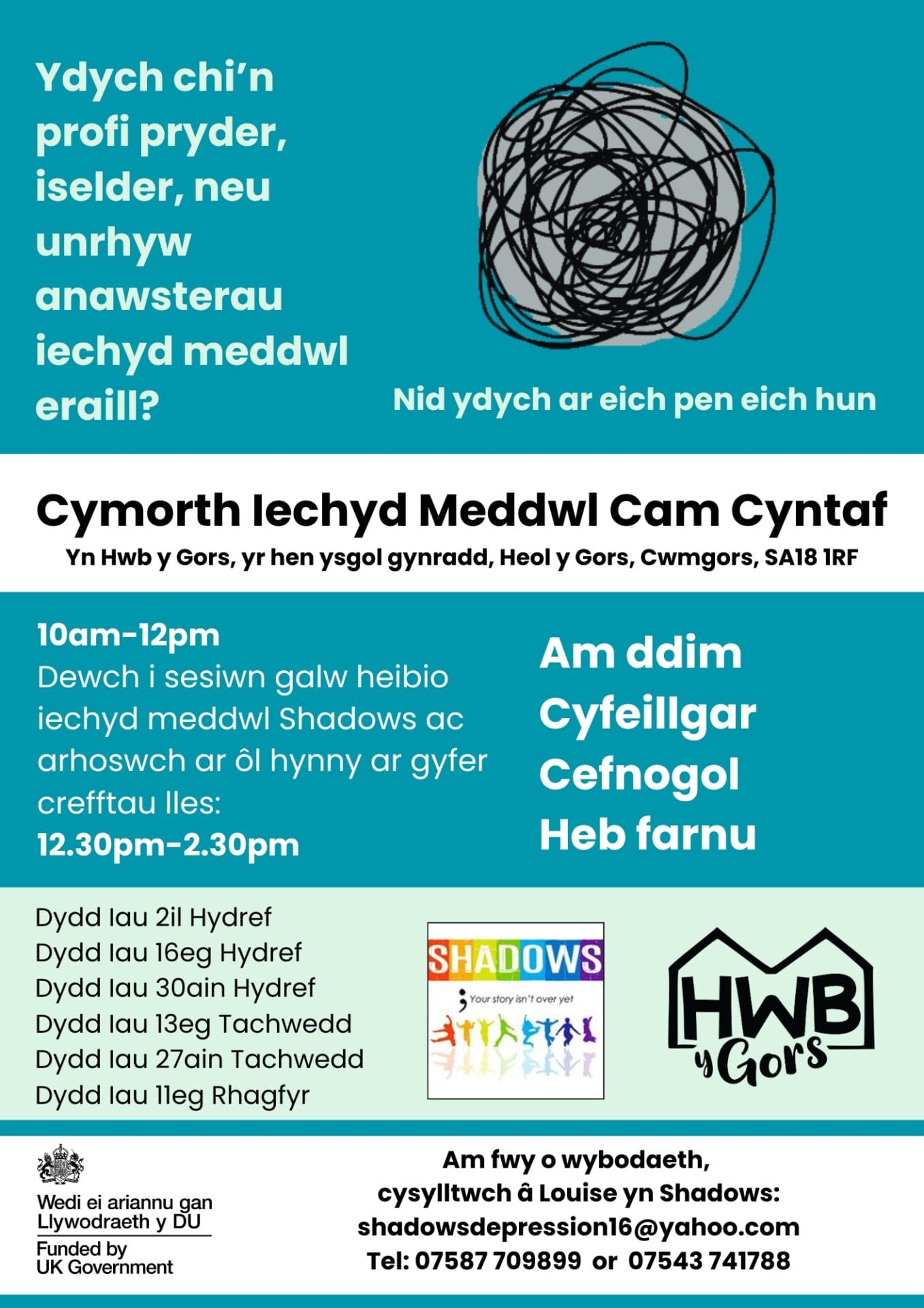 Rydym wedi lansio rhaglen Cymorth Iechyd Meddwl Cam Cyntaf mewn partneriaeth â Grŵp Cymorth Iselder Shadows, ac rydym yn dathlu treftadaeth leol trwy ein Prosiect Mosaig Cymunedol, lle mae’r artist Dani Lee yn gweithio gyda’r gymuned i greu murlun mosaig trawiadol ar gyfer gerddi Hwb.